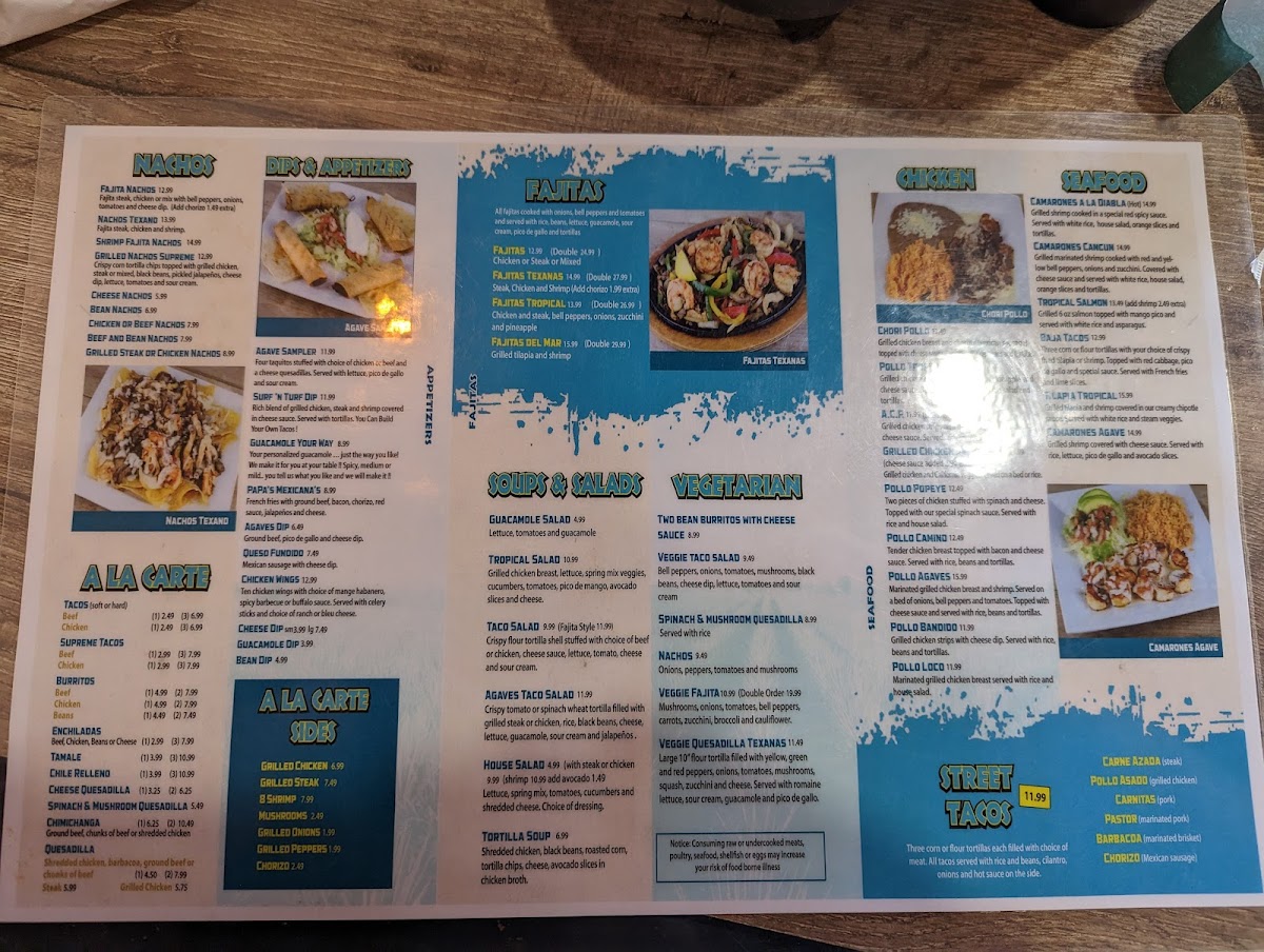 Grilled chicken or steak, onions, peppers, and tomatoes. Served with rice, beans, lettuce, pico de gallo, guacamole, sour cream, and tortillas.