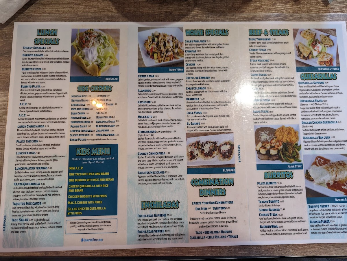 Enchilada options include 1 or 2 pieces, with fillings of beef, cheese, or chicken.